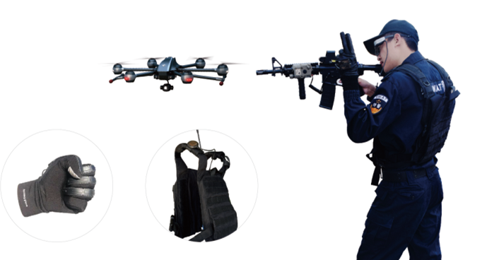 穿戴式單兵無人機作戰(zhàn)系統(tǒng)集無人機、戰(zhàn)術(shù)背心、戰(zhàn)術(shù)手套、單目AR眼鏡于一體;操控人員戴上內(nèi)置有各種感應(yīng)器的戰(zhàn)術(shù)手套,通過單手手勢便可控制無人機飛行,完全無需依賴遙控器;同時通過戰(zhàn)術(shù)背心和AR眼鏡,可實現(xiàn)無人機跟隨式飛行,并實時將偵察畫面回傳至作戰(zhàn)隊員眼鏡,為作戰(zhàn)隊員增添一只始終跟隨的“天眼”,實時獲取情報支援。